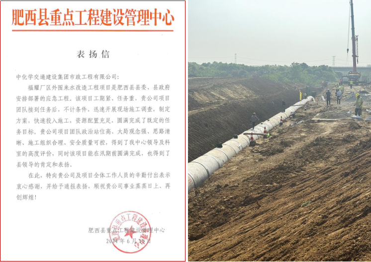 肥西县重点工程建设管理中心指出,福耀厂区外围来水改造工程项目是合肥市肥西县委、县政府安排部署的应急工程。该项目工期紧、任务重,市政公司项目团队接到任务后,不计条件,迅速开展现场施工调查,制定方案,快速投入施工,资源配置充足,在汛期前圆满完成了既定任务目标。市政公司项目团队政治站位高、大局观念强、工作思路清晰、施工组织合理、安全质量可控,得到了县委、县政府高度评价。彰显了中国化学央企担当,展现了市政公司实干风采。