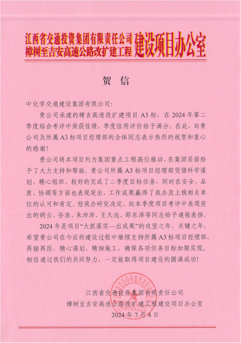 近日,江西交投樟吉高速改扩建项目办公室发来贺信,祝贺中国化学交建公司樟吉项目2024年第二季度综合考评中获得优异成绩,给予季度信用评价满分,并向全体参建人员表示热烈的祝贺和衷心的感谢!