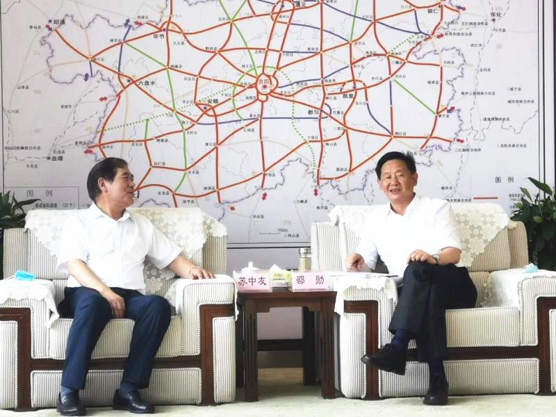 6月17日,公司党委书记、董事长苏中友,总经理沈周在贵阳会见贵州省交通运输厅党委书记、厅长邵勋,就贵州交通基础设施建设、县乡公路改善提升工程等方面进行了深入交流。贵州省交通运输厅党委委员、副厅长龙平江,公司副总经理林泉海参加会见。