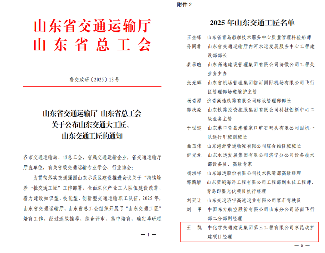 近日,山东省交通运输厅公布了2025年“山东交通大工匠”和“山东交通工匠”名单,中国化学工程交建公司所属第三工程有限公司京昆改扩建项目经理王凯获评“山东交通工匠”。
